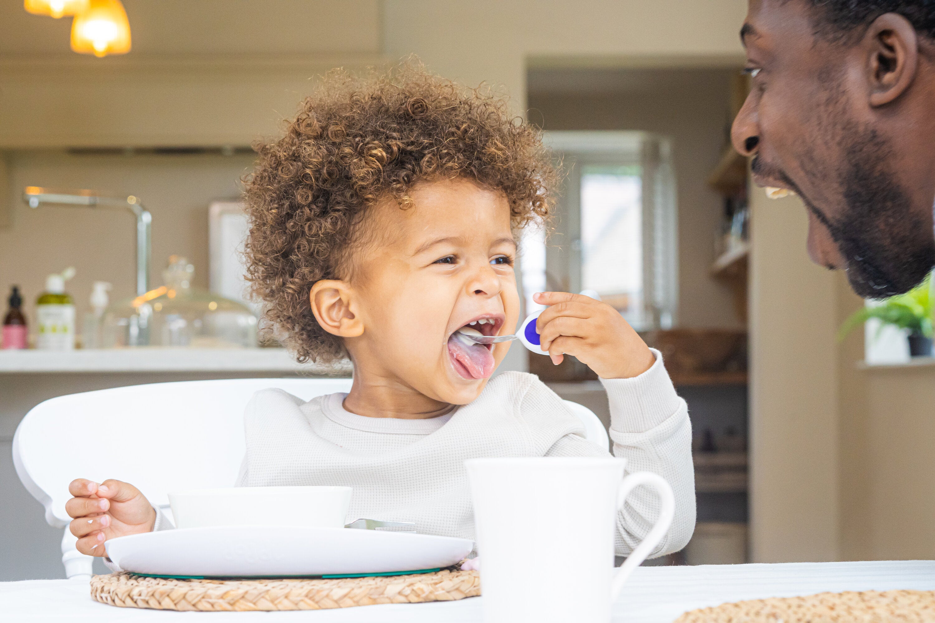 - Simply lay the toddler spoon and toddler fork on the tray/table alongside their food